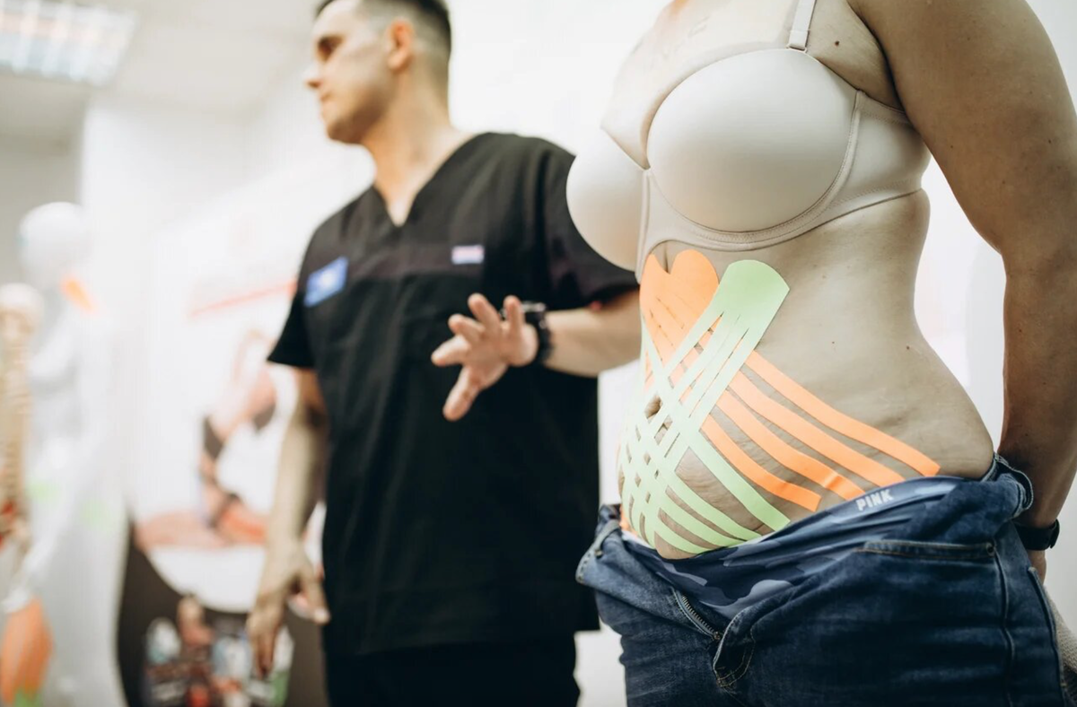 Тейпирование с целью проработки подкожно-жирового слоя в области живота и на боках